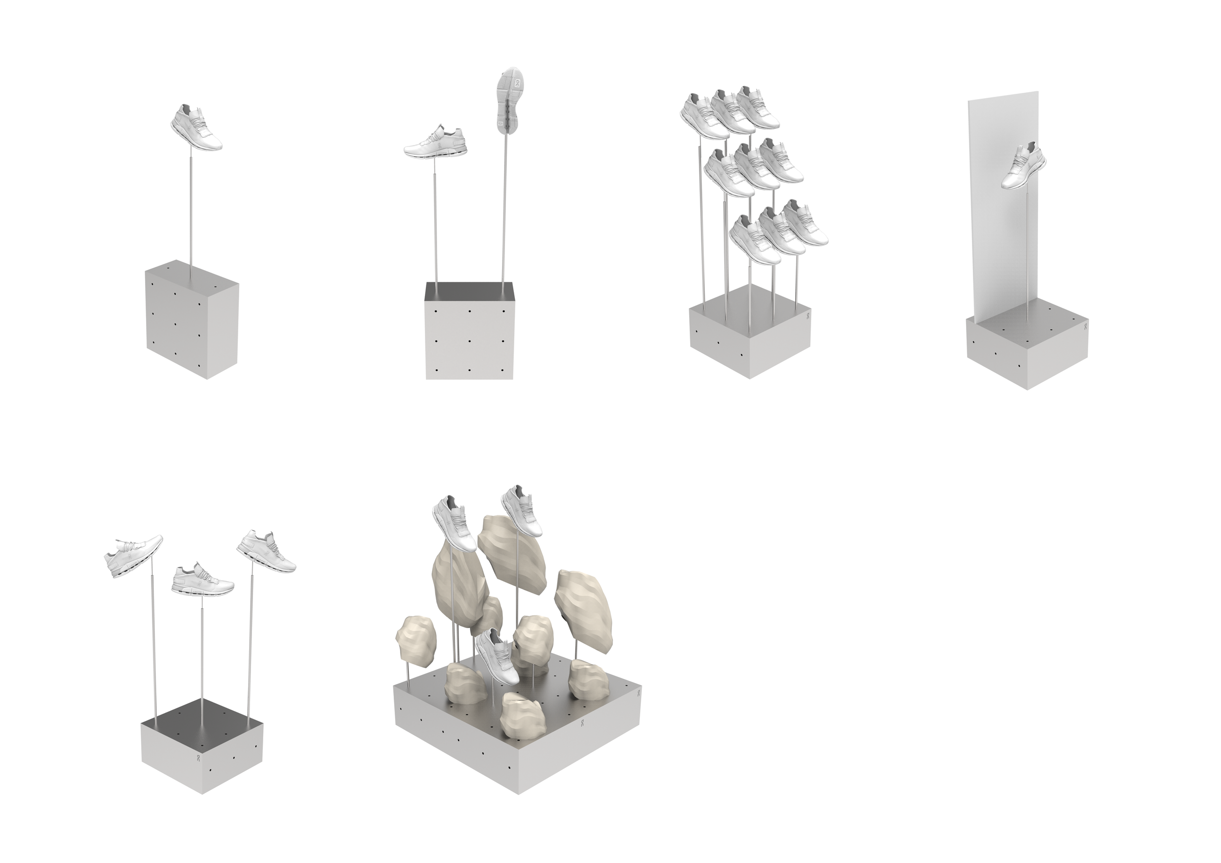 Modular tool kit designed to present product campaigns in stores and in window displays. The design is based on a product platform that can be used in infinite configurations with a set of simple tools and accessories. The platform can be reused for every campaign as well as the set of tools that can be updated depending on specific needs. Visual accessories such as banners, 3D campaign objects or other materials dressing the base structure can be updated for each campaign. This modular concept reduces the amount of waste created for each campaign installation. The tool kit was designed with a minimal and premium aesthetic that could withstand lots of wear and tear in the retail spaces.