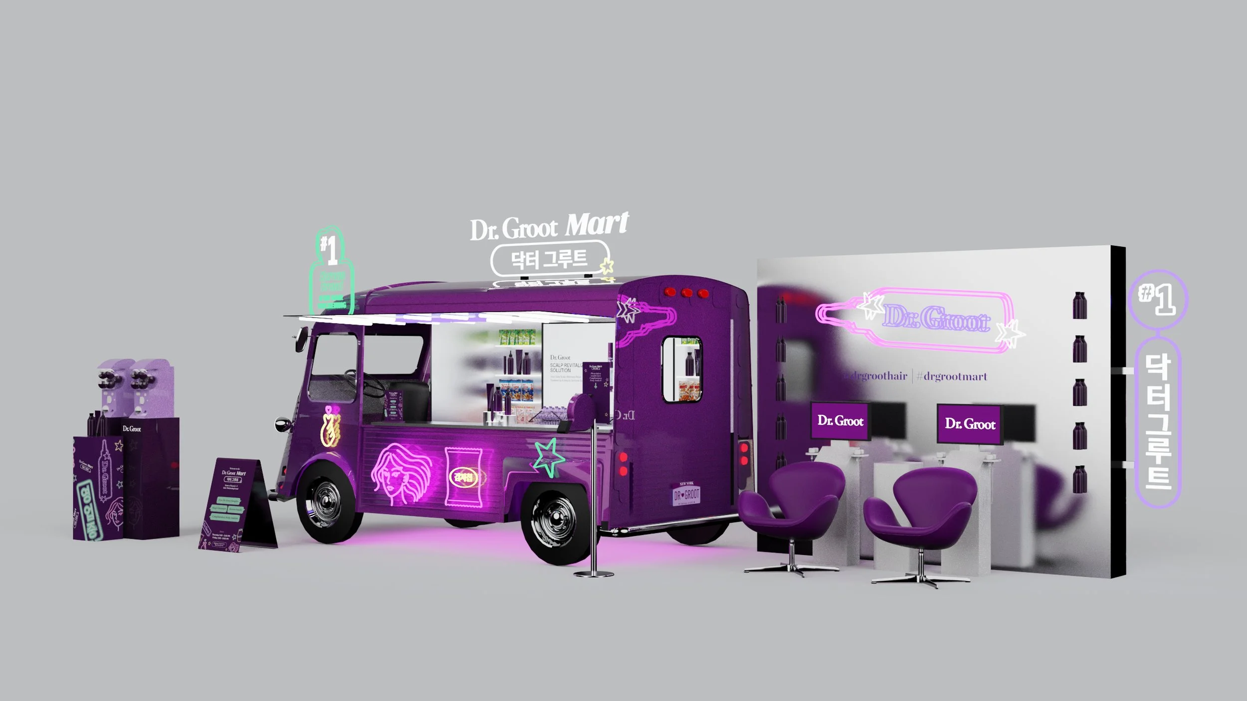 The Dr. Groot truck in New York was designed to showcase the Dr. Groot haircare technology and it’s Korean heritage. Drawing inspiration from Korean night markets the truck was covered in neon signs in bright colors with Korean messaging, graphic symbols and branding. Reflective and metallic surfaces were used throughout to create depth and interesting reflections from the neons. The interior of the truck featured product displays, screens playing brand content, hair care related gifts all mixed up with korean snacks. Connected to the truck was a reflective product display wall and interactive area where brand technicians performed scalp analysis on guests. The backside of the freestanding wall featured a large scale back lit graphic that together with the neons made the design come to life more and more as the sun was setting.