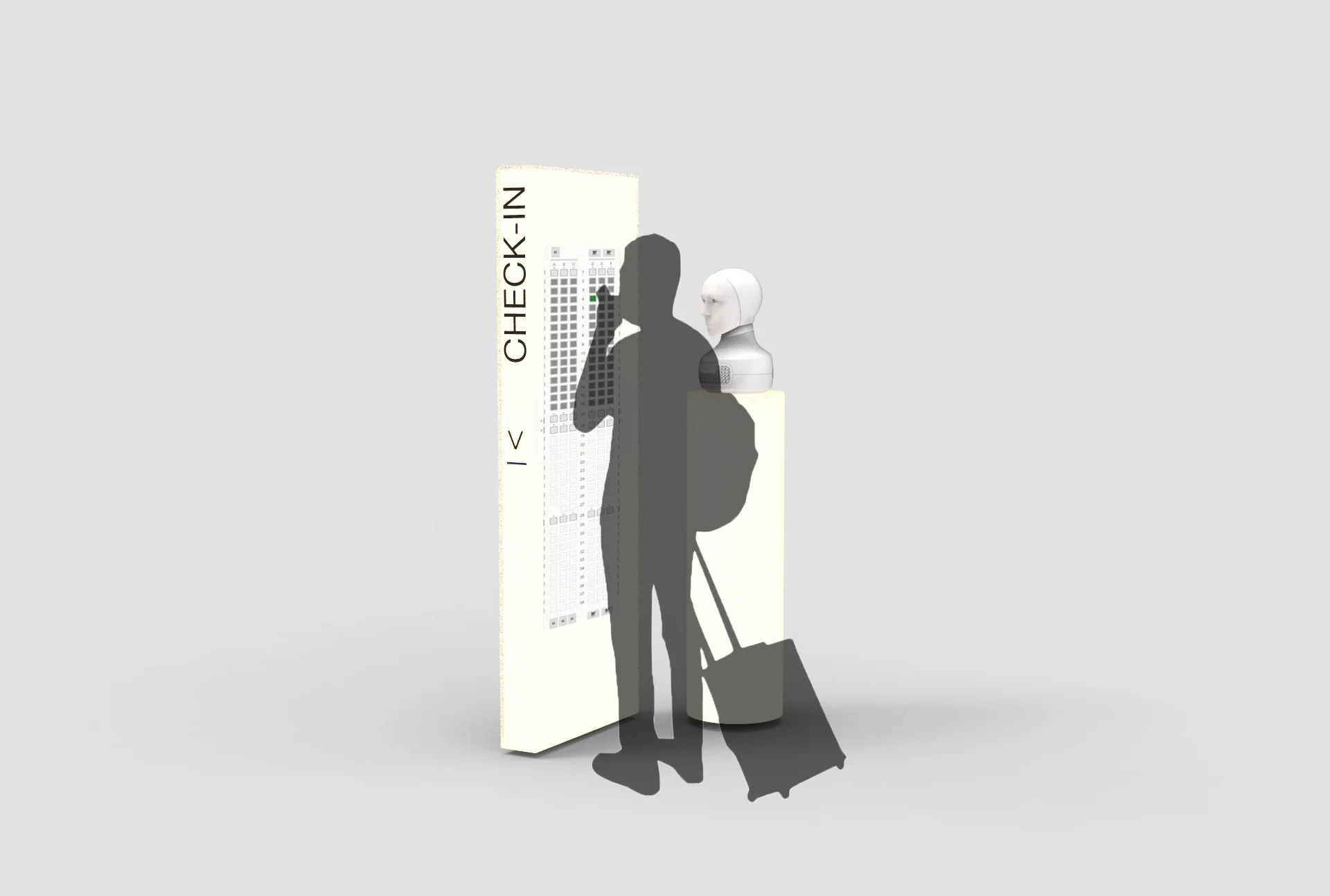Airport check-in and information desk concept for Furhat Robotics. Design of check-in counter and information desk that supports the interactive functions of Furhat Robotics social robot. The minimal set up using simple shapes, light and bold graphics is designed to make travelers intuitively approach and use the assisting robot to check-in or find their way around the airport.