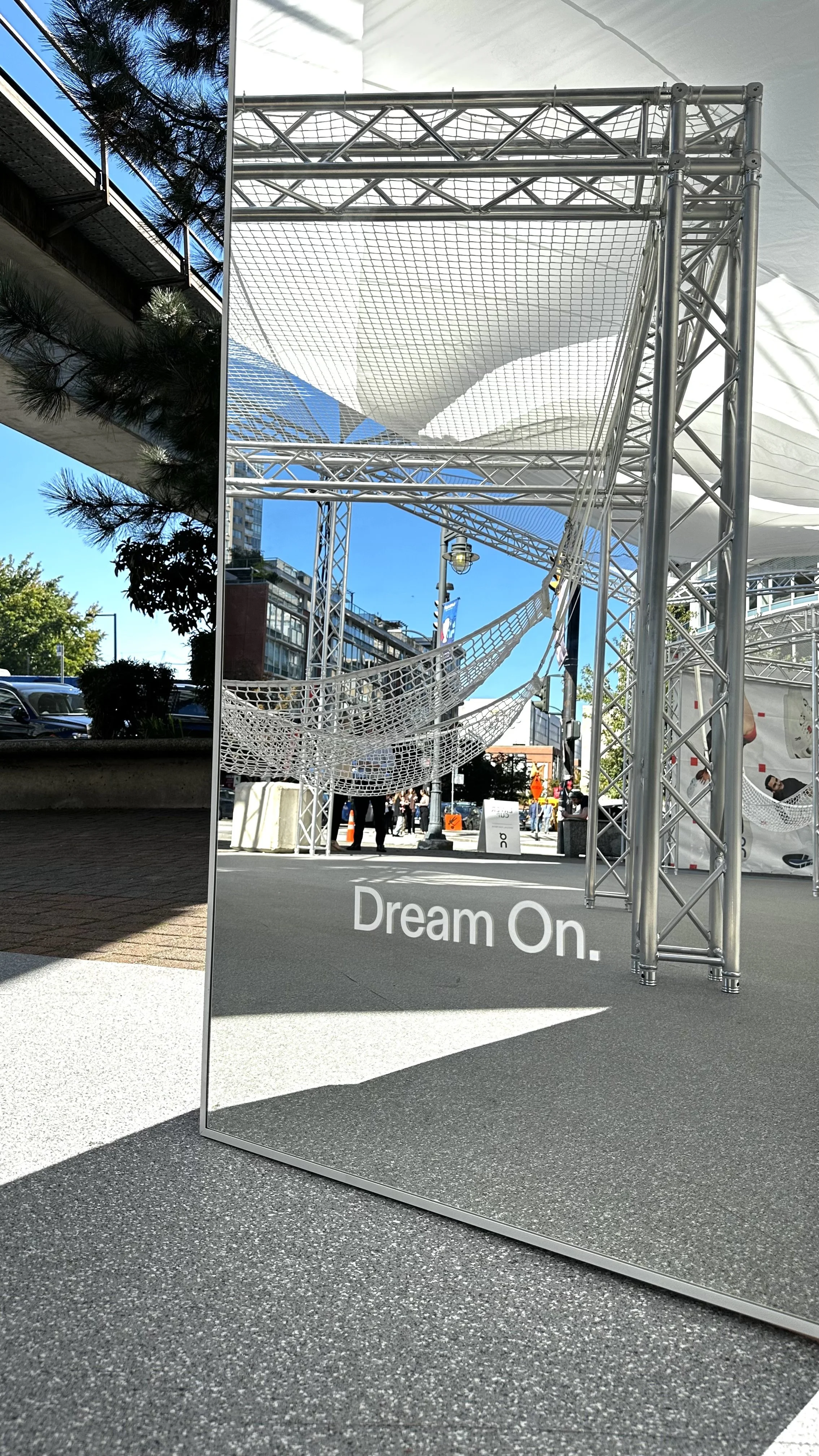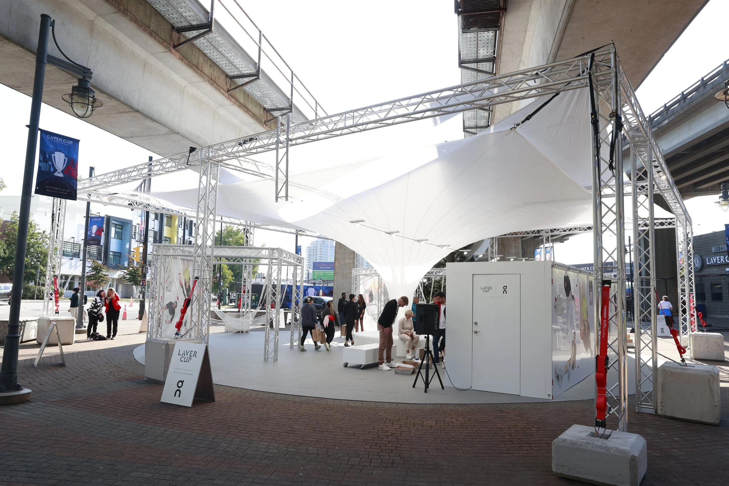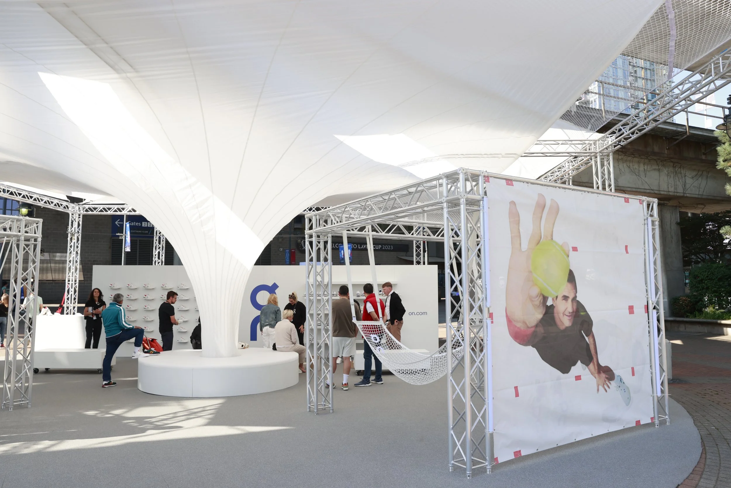 On Laver Cup pop-up shop Vancouver 23. Design and development of pop-up shop designed to create brand awareness and sell tennis shoes during the Laver Cup tennis tournament in Vancouver. The goal was to create an impactful yet functional space for tennis fans to connect with the brand, try on shoes and make purchases in a time efficient way in-between games. Both during day and night time. The space was designed in a modular way to allow large volumes of customers to pass through as well as to withstand changing weather conditions. Signature branded tennis net hammocks that were designed, developed and engineered for the previous US Open event were re-used to create an instagrammable space for players to relax and connect with the brand.