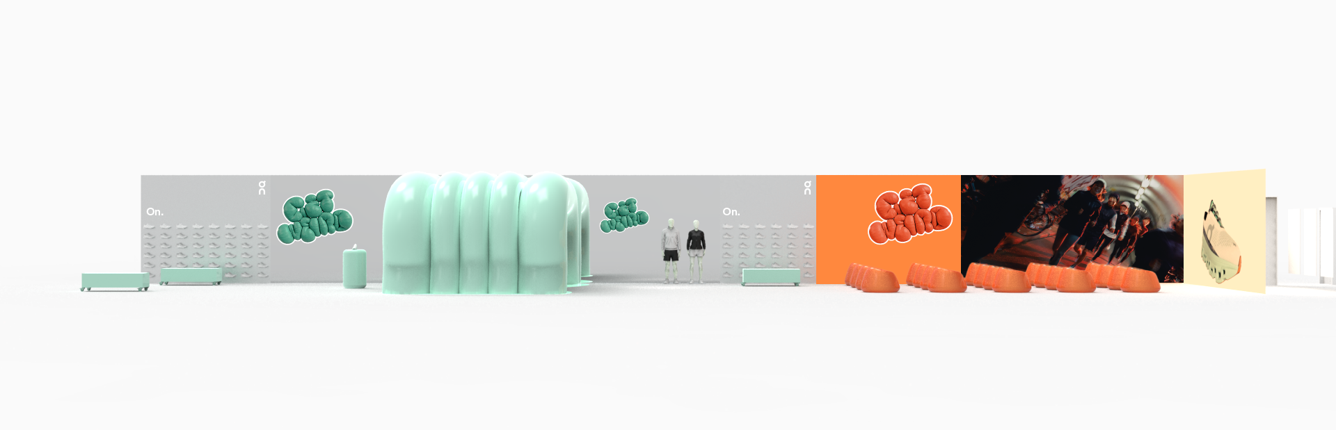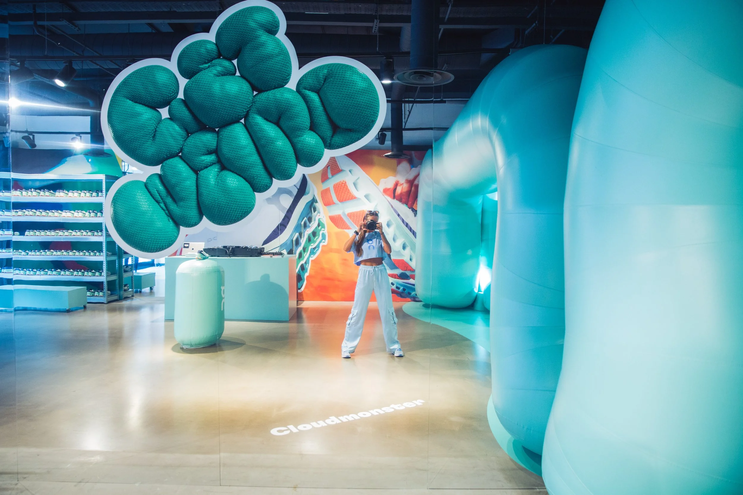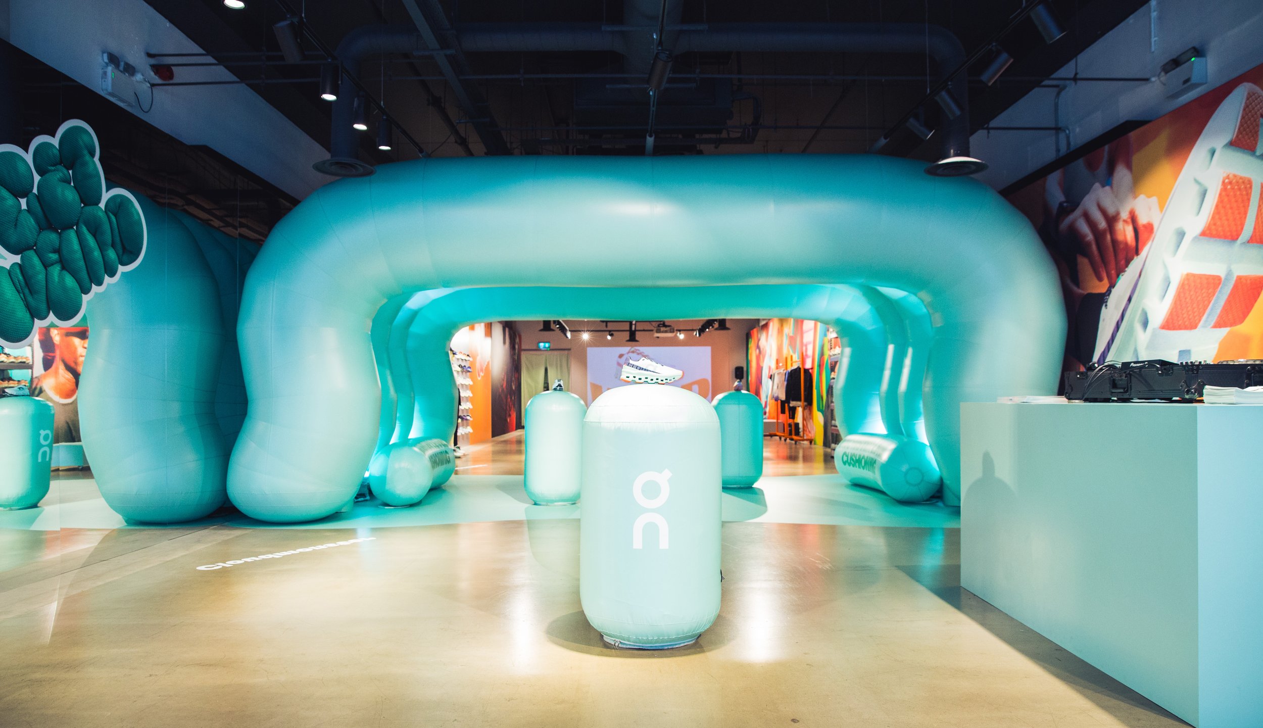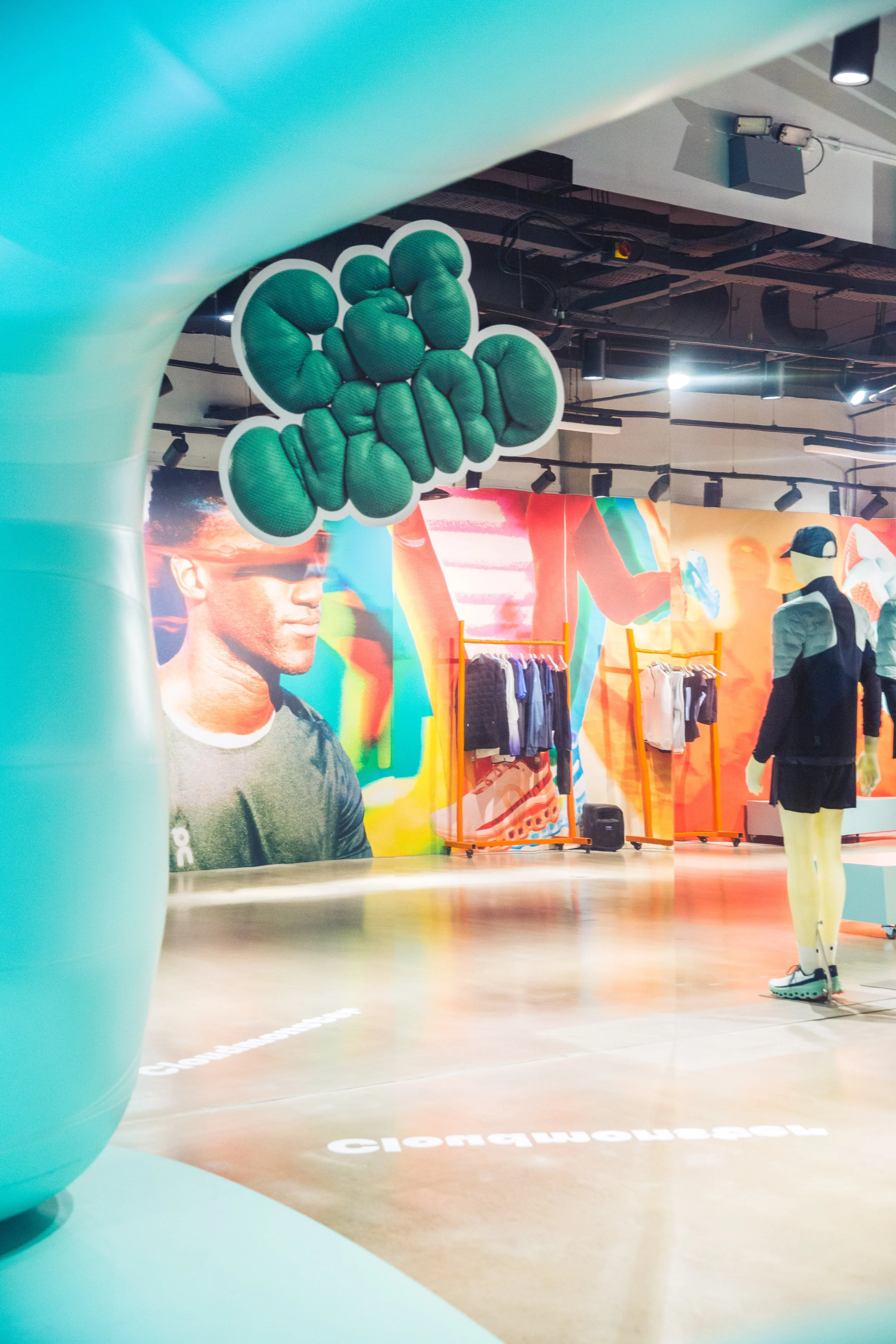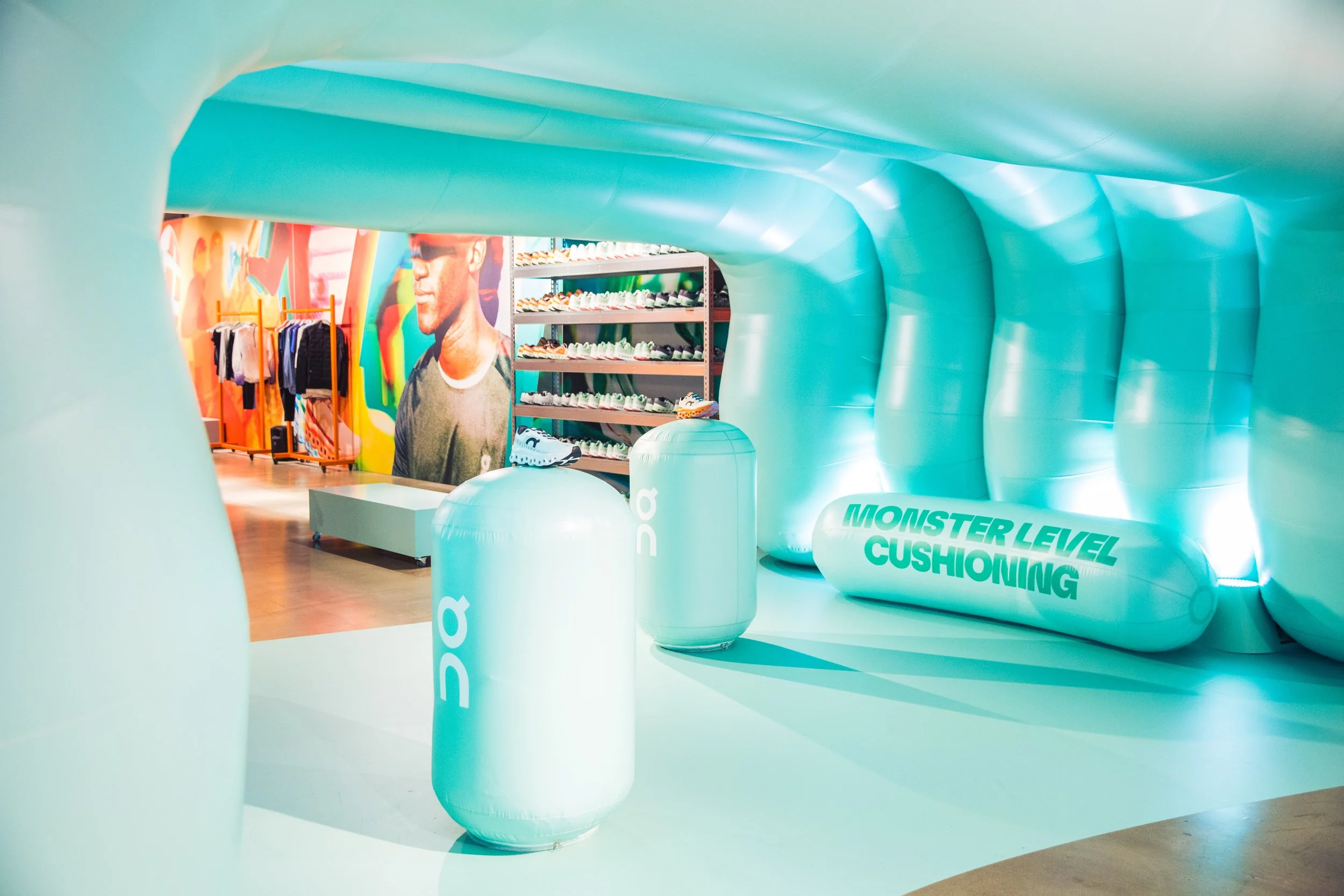 On Cloud Monster pop-up shop Liverpool 23. Creative Direction, Design, Engineering, Development, Sourcing/onboarding of supplier and Project Management. Concept based on the Monster voluminous sole of the On Cloud Monster Shoe. The shoe is all about maximized cushioning and daring to be weird and unique. The elongated shop space was split into two areas by a ginormous inflatable tunnel. The Tunnel created an immersive Instagrammable experience. Customers were able to feel the extreme cushioning by bouncing on one of the two sausage shaped seats and by leaning back against the bouncy walls. This whilst surrounded by the aquatic color of the shoe as if being in an illuminated under water cave. The space was designed for visitors to have fun, get weird and to be immersed by the key features of the shoe. All with the product being presented as a center piece. The space in front of the tunnel served as a retail space to try on and purchase the Monster shoe whilst enjoying the good vibes from the DJ booth. The space behind the tunnel had a modular design that allowed it to transform from a retail space for apparel and an extended shoe collection to a community space. It hosted yoga sessions, motivational talks and presentations as well get togethers for the local run community. Throughout the space vibrant collage graphics were combined with mirrors and stickers, creating layers that would allow visitors to become a part of the monster collage themselves. In the community space a part of the wall was left blank so that the local run club could create their own collage of memories. Custom made monster stickers were handed out to visitors to inspire them to create their own collage graphics. Every detail of the space was carefully curated to excite, energize and inspire visitors to become part of the On brand and the Cloud Monster Get Weird movement.