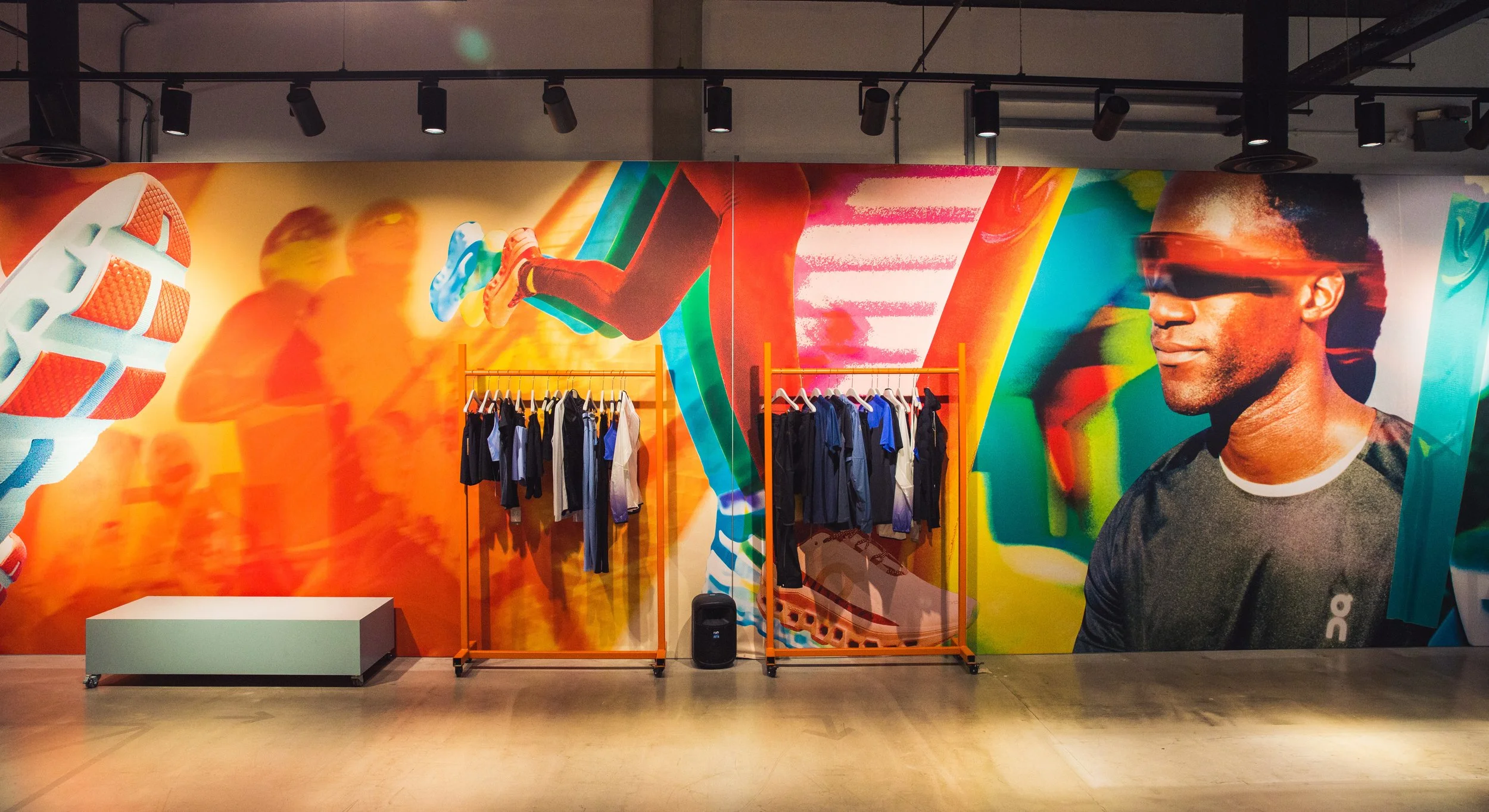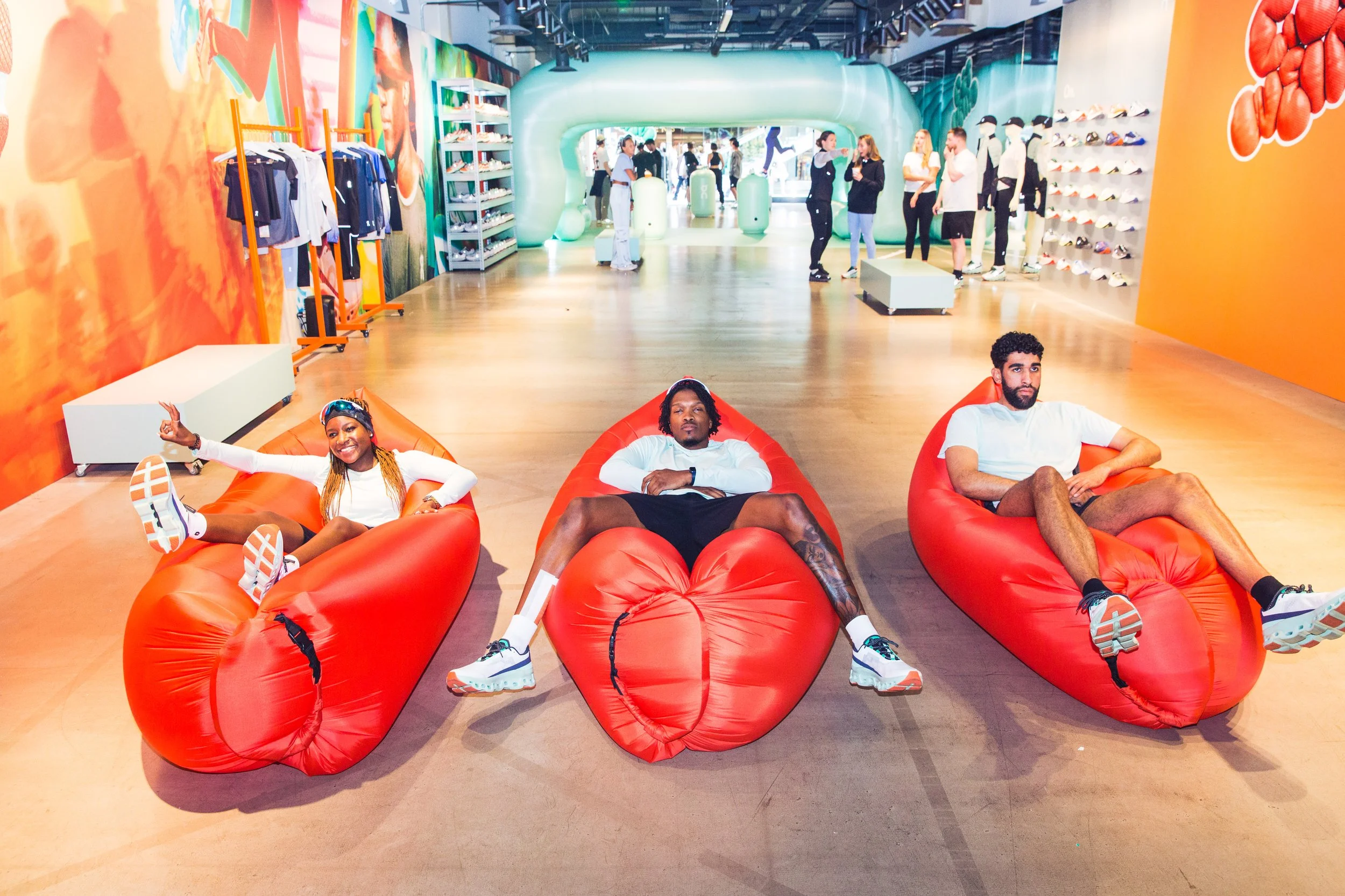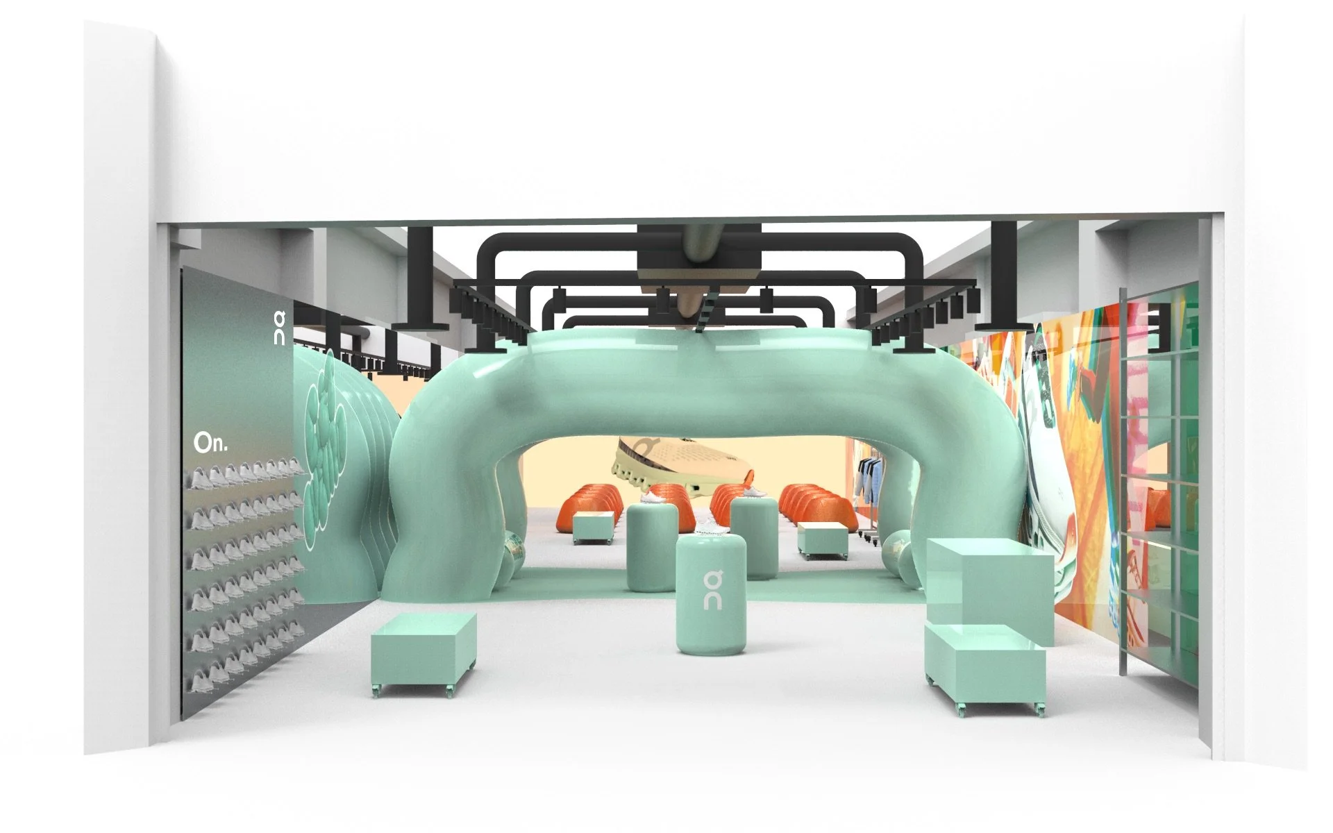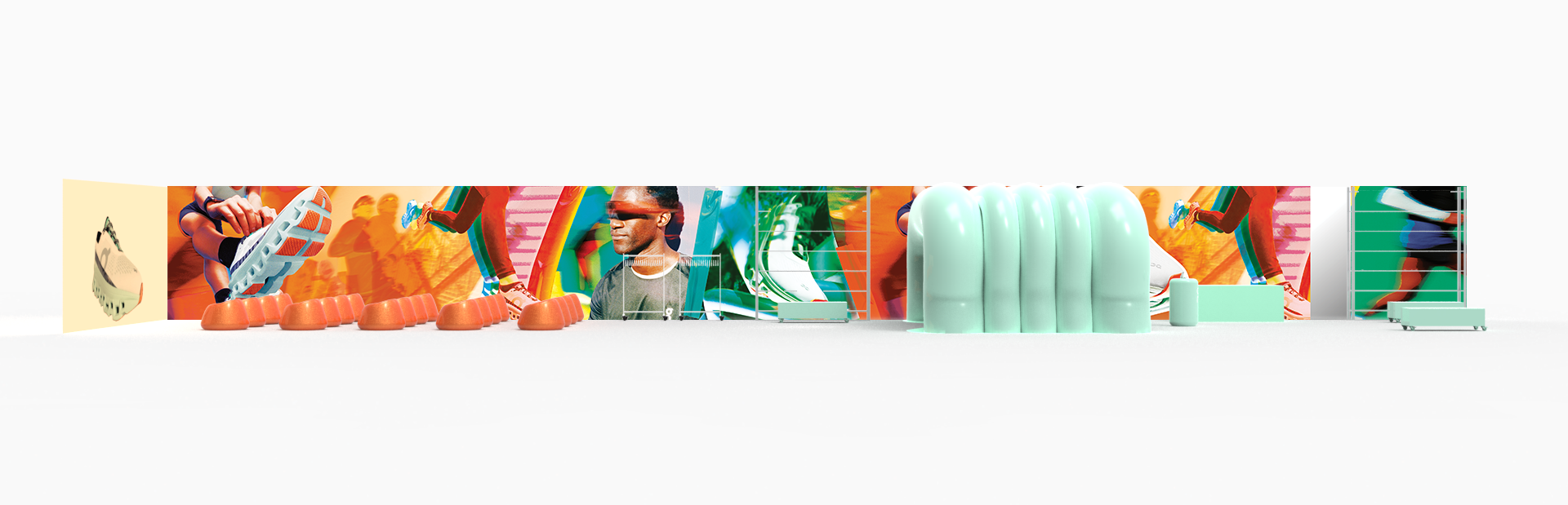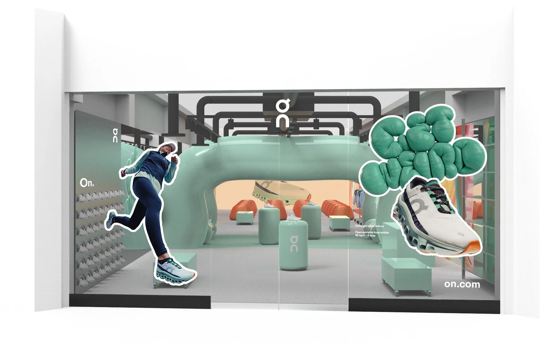 On Cloud Monster pop-up shop Liverpool 23. Creative Direction, Design, Engineering, Development, Sourcing/onboarding of supplier and Project Management. Concept based on the Monster voluminous sole of the On Cloud Monster Shoe. The shoe is all about maximized cushioning and daring to be weird and unique. The elongated shop space was split into two areas by a ginormous inflatable tunnel. The Tunnel created an immersive Instagrammable experience. Customers were able to feel the extreme cushioning by bouncing on one of the two sausage shaped seats and by leaning back against the bouncy walls. This whilst surrounded by the aquatic color of the shoe as if being in an illuminated under water cave. The space was designed for visitors to have fun, get weird and to be immersed by the key features of the shoe. All with the product being presented as a center piece. The space in front of the tunnel served as a retail space to try on and purchase the Monster shoe whilst enjoying the good vibes from the DJ booth. The space behind the tunnel had a modular design that allowed it to transform from a retail space for apparel and an extended shoe collection to a community space. It hosted yoga sessions, motivational talks and presentations as well get togethers for the local run community. Throughout the space vibrant collage graphics were combined with mirrors and stickers, creating layers that would allow visitors to become a part of the monster collage themselves. In the community space a part of the wall was left blank so that the local run club could create their own collage of memories. Custom made monster stickers were handed out to visitors to inspire them to create their own collage graphics. Every detail of the space was carefully curated to excite, energize and inspire visitors to become part of the On brand and the Cloud Monster Get Weird movement.