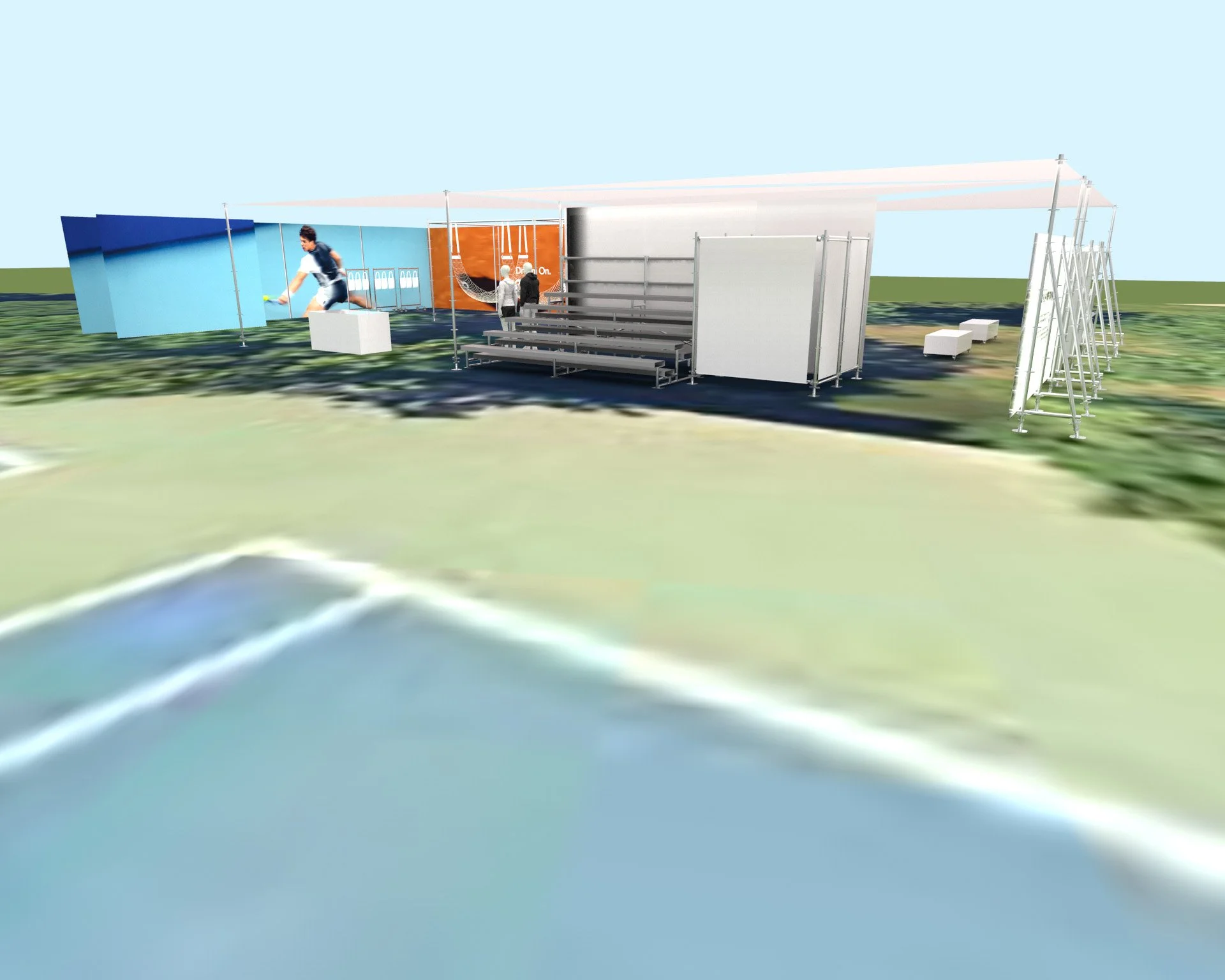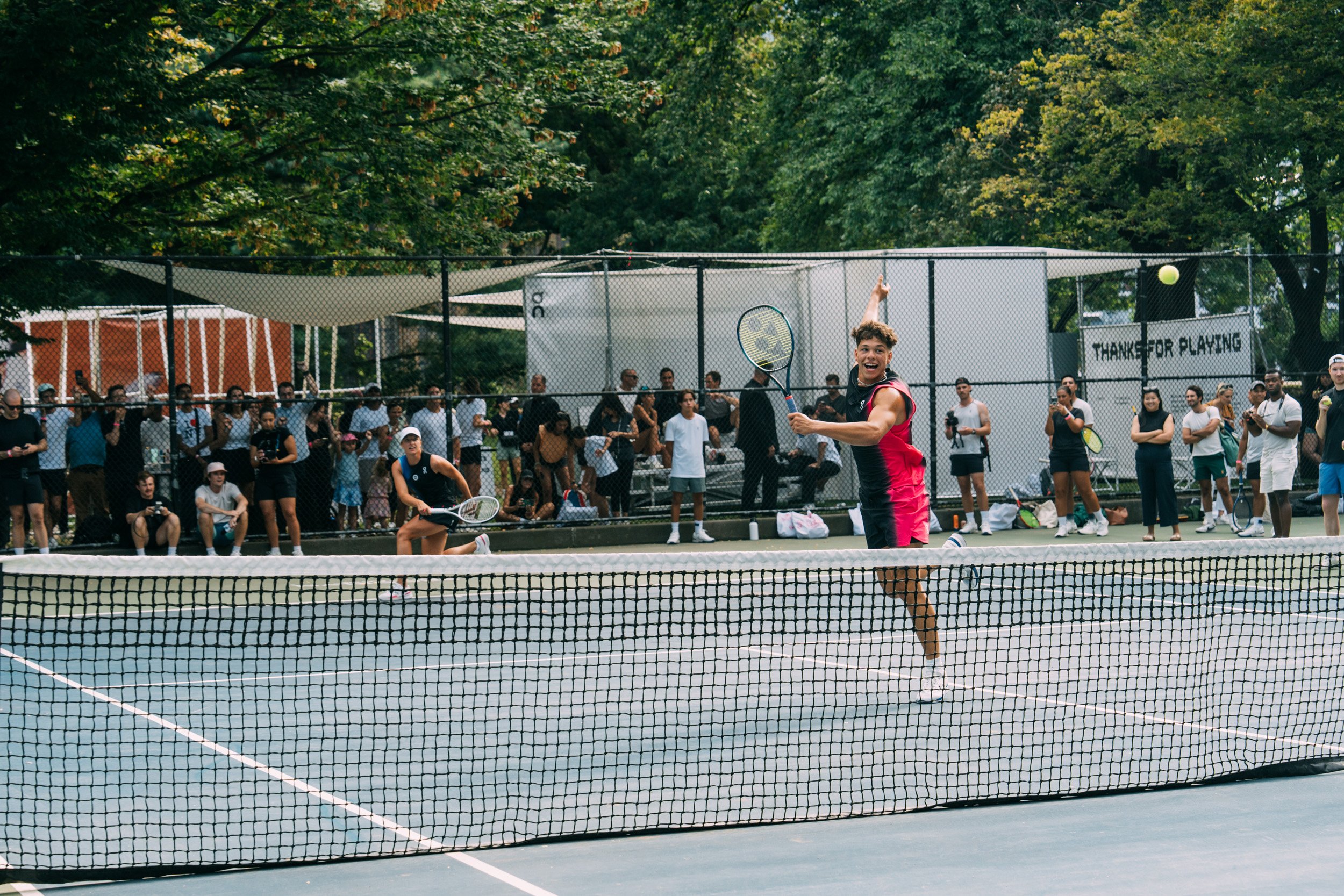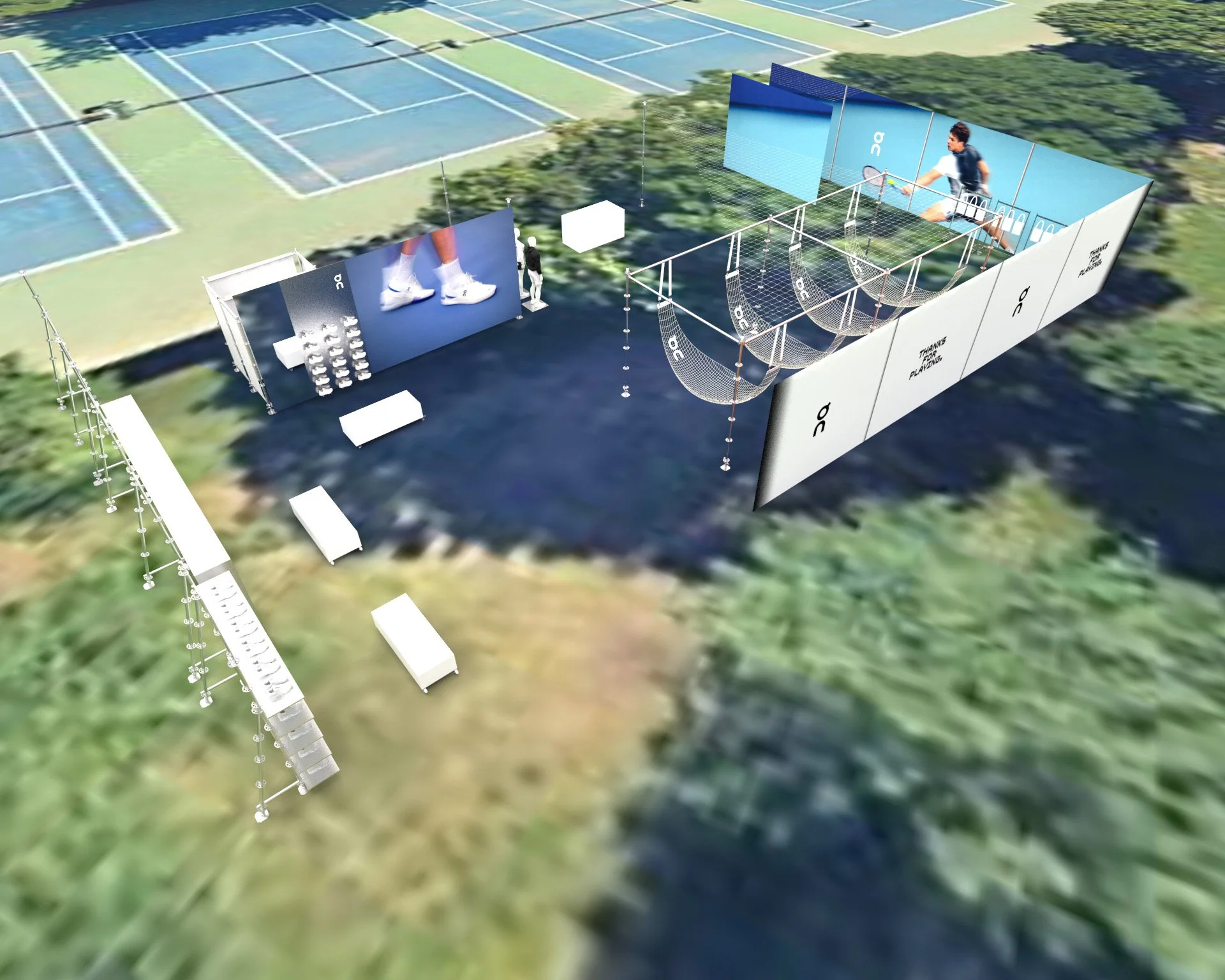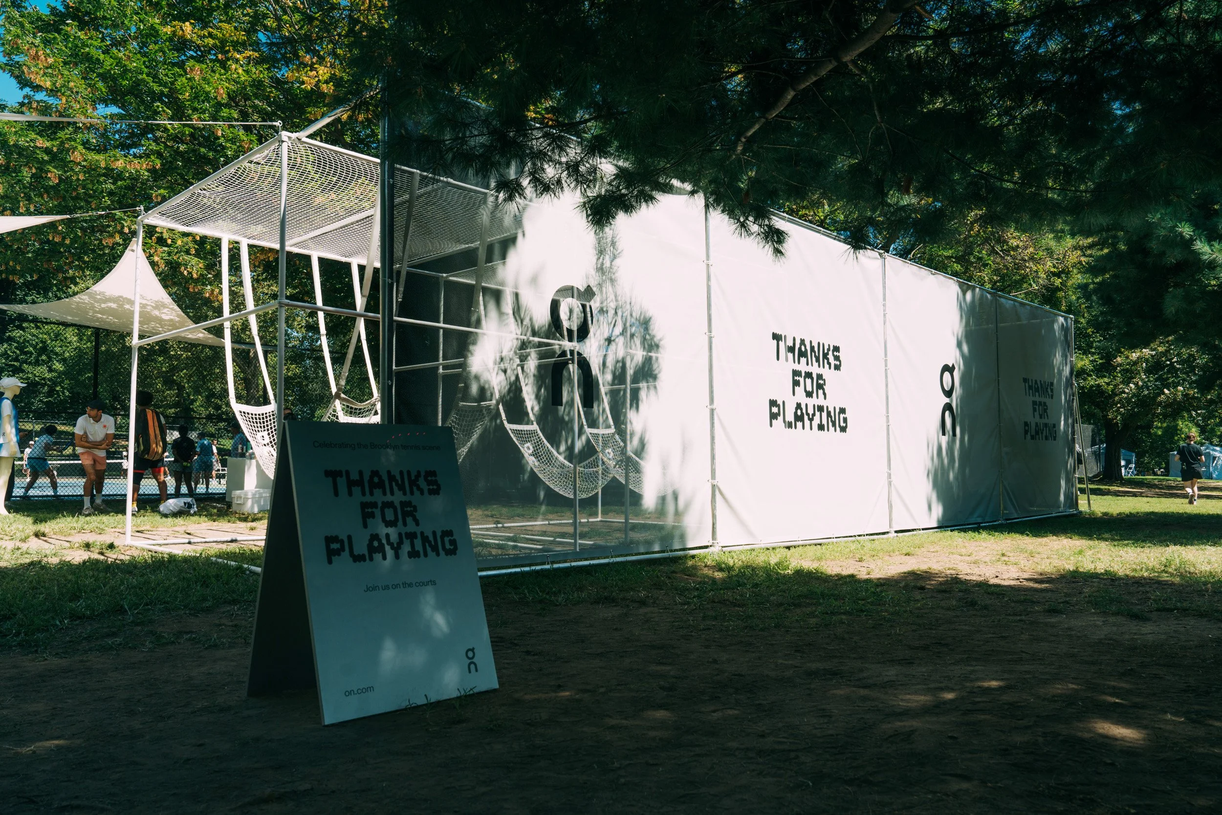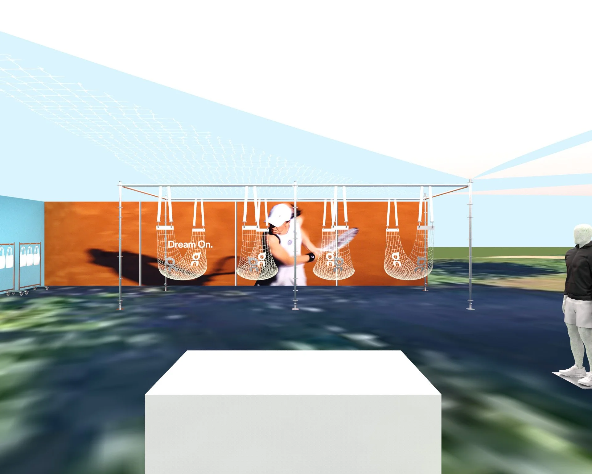 On Courtside Pro shop US Open New York 23. Tennis community event in Fort Greene park, Williamsburg. Design and development of a space that allowed dedicated tennis players to get a pro athlete experience for a day. The space included lockers filled with head-to-toe outfits, changing rooms, tennis shoe display wall, shoe try-on area, spectator area, branded tennis courts and on-court furniture, racket stringing area, airbrush activation station, a bar with refreshments and a lounge area. Design, engineering and development of custom tennis net hammocks that made up the lounge area. The branded tennis net hammocks created an instagrammable space for players to relax, unwind and connect with the brand.